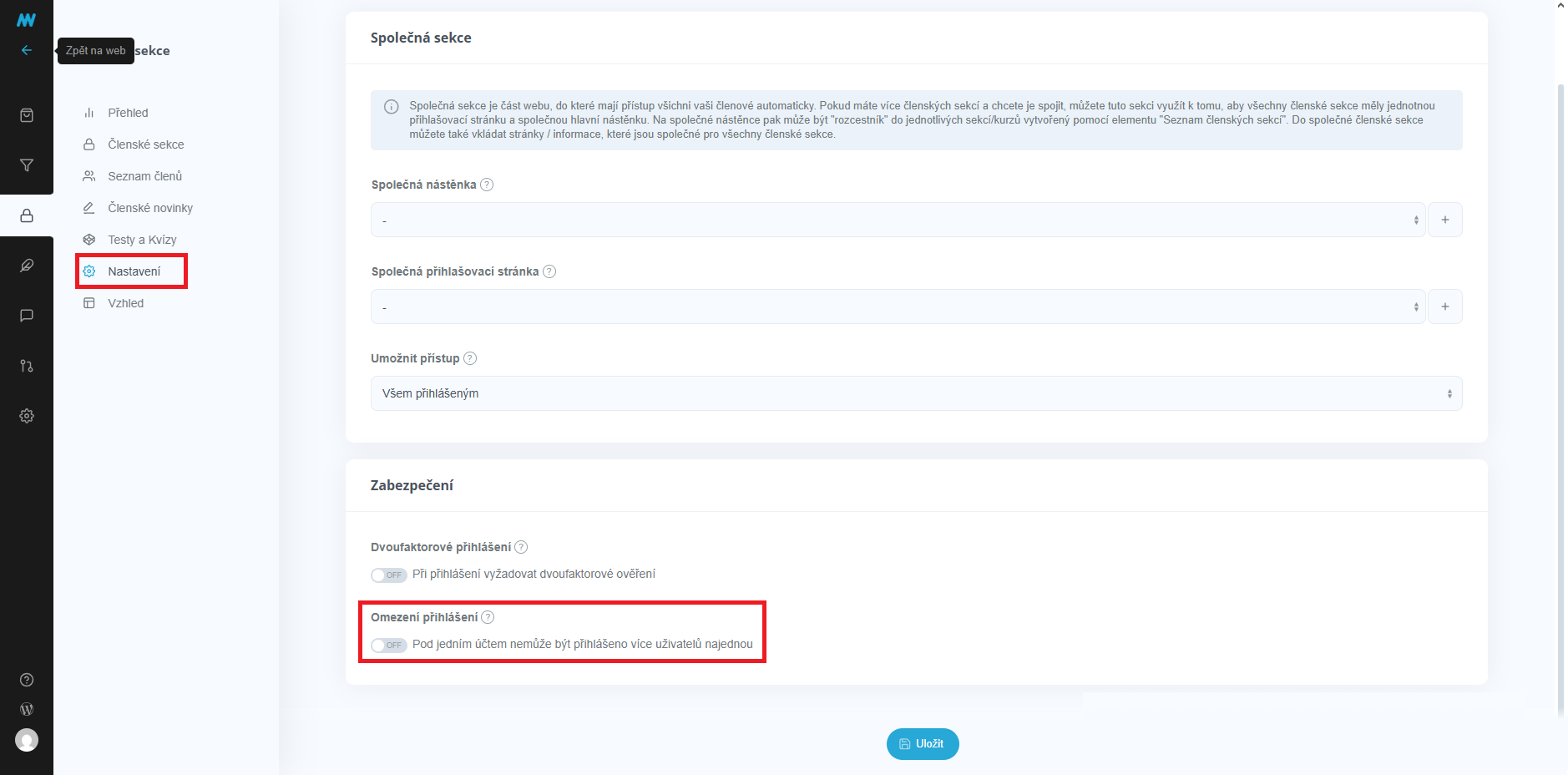 Omezení přihlášení lze zapnout v nastavení Členské sekce > Nastavení > Zabezpečení a následně zapnutím přepínače "Omezení přihlášení"